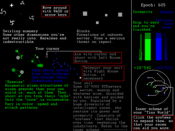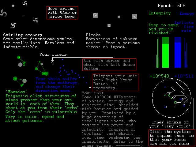You are a hyperstellar being in control of some 10^9000 WTFmeters of matter, energy and whatever else, encapsulated in a spherical unit, floating in the middle of unknown aka the real world. Your "tiny" world is populated with a huge diversity of intelligent races (none of which are even important on this scale), who restore its power and integrity, as enigmatic alien structures of even greater sizes roam around and perpetually attack. Unit integrity and energy depend on the inner systems that collapse over time, weakening the inhabitants, and the whole defensive logic. Only you can expand the systems to fix this, but your fight with the universal enthropy will never end.